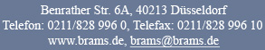 Rechtsanwalt Herms Michael Brams sind als Rechtsanwälte in der Bundesrepublik Deutschland zugelassen. Die Berufsbezeichnung "Rechtsanwalt" wurde in der Bundesrepublik Deutschland verliehen. Beide Rechtsanwälte sind Mitglieder der Rechtsanwaltskammer Düsseldorf |